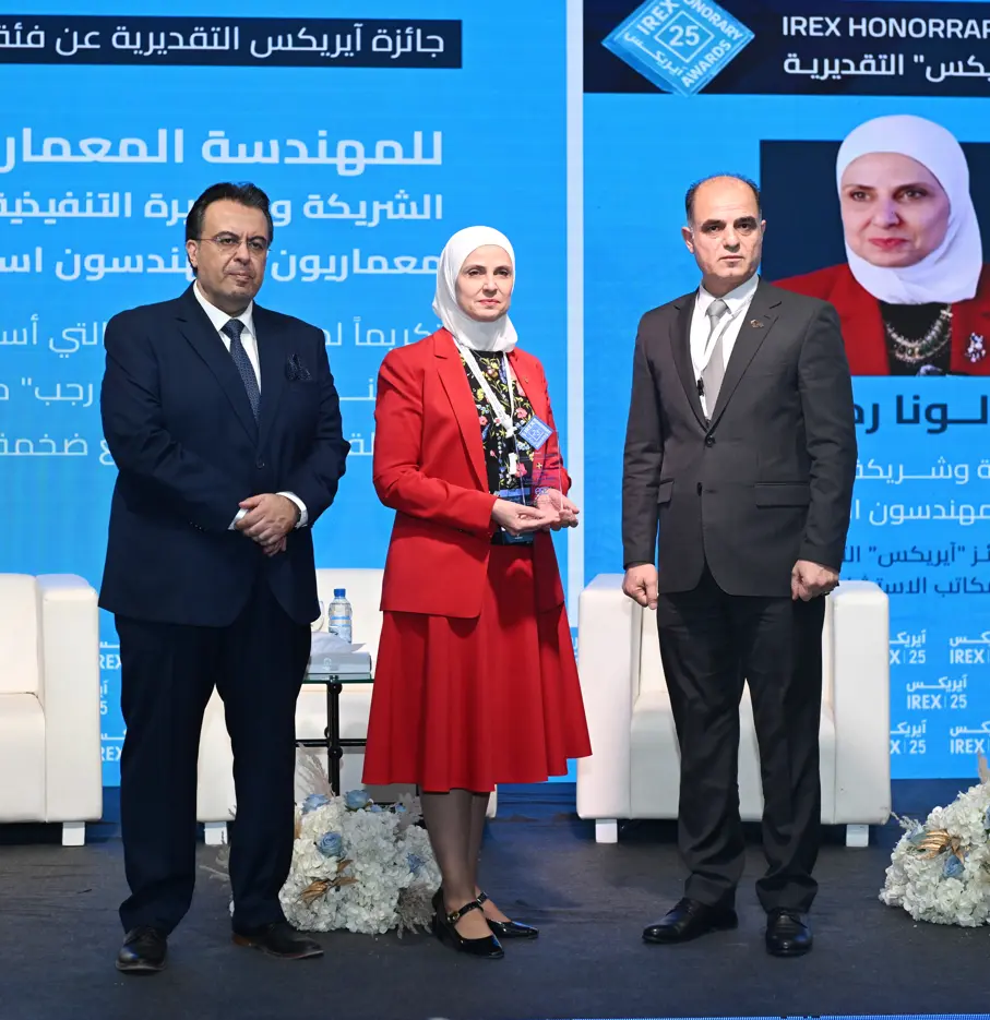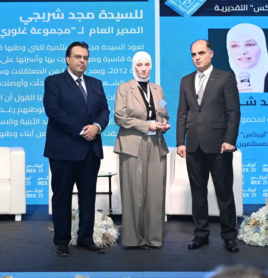 جائزة آيريكس التقديرية الخاصة عن فئة الاستثمار والتطوير العقاري: الأستاذة "مجد شربجي" المديرة العامة لشركة غلوري الدولية، من أوائل المستثمرين العقاريين السوريين العائدين إلى وطنهم.