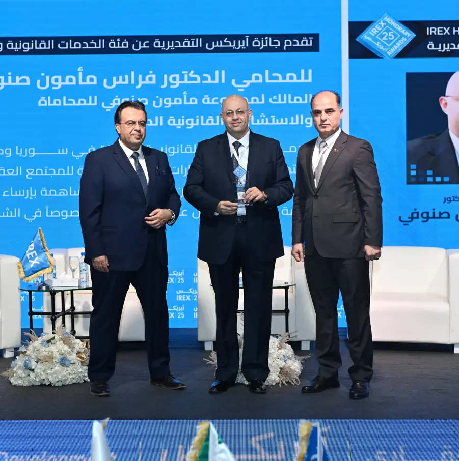 فئة الخدمات القانونية والمالية: المحامي الدكتور "فراس مأمون صنوفي"، رئيس مجلس إدارة مركز دمشق الإقليمي للتحكيم الدولي، المالك والمدير العام لمجموعة مأمون صنوفي للمحاماة والاستشارات القانونية الدولية لنحو 59 عاماً.
