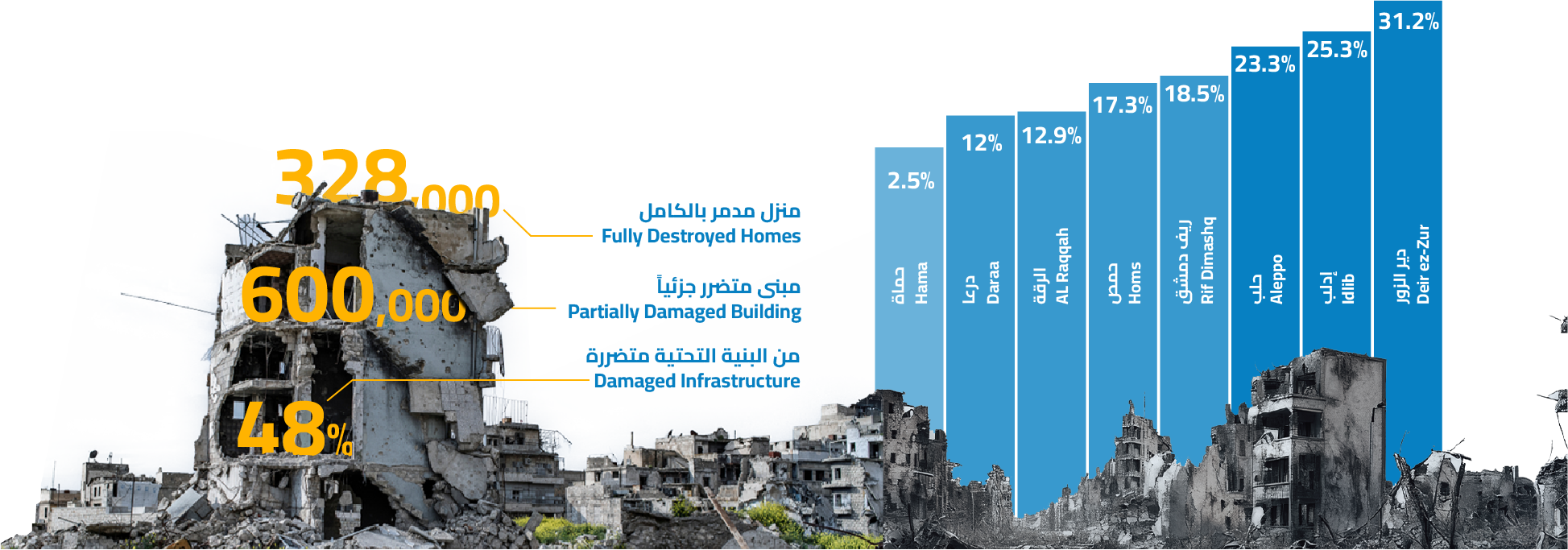 The cost of reconstruction is estimated at between $250 billion and $400 billion, and some estimates say that reconstruction requires $900 billion, and a 2017 World Bank report indicates that the war in Syria has caused widespread destruction of housing and infrastructure. A third of housing in Syria has been damaged or completely destroyed. The Syrian Human Rights Network also reported in 2018 that nearly three million homes had been completely or almost completely destroyed.